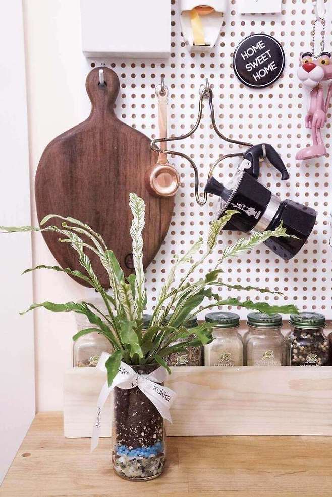 주방에도 식물을 두었어요. 남편이 다 마신 정종 유리병에 심어보았는데 굳이 화분을 사지 않고 예쁜 병이나 깡통으로 분갈이해도 정말 좋은 것 같아요.
