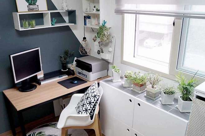 서재 쪽 모든 공간은 우드 책상을 제외하고 수납장, 선반 모두 직접 만들거나 오래된 가구를 리폼해서 사용하고 있어요. 창 밑에 있는 수납장은 월넛 옷장이었던 가구를 화이트로 리폼해서 책을 수납했고, 상판은 그레이 타일을 붙여 화분을 올릴 수 있게 했어요.