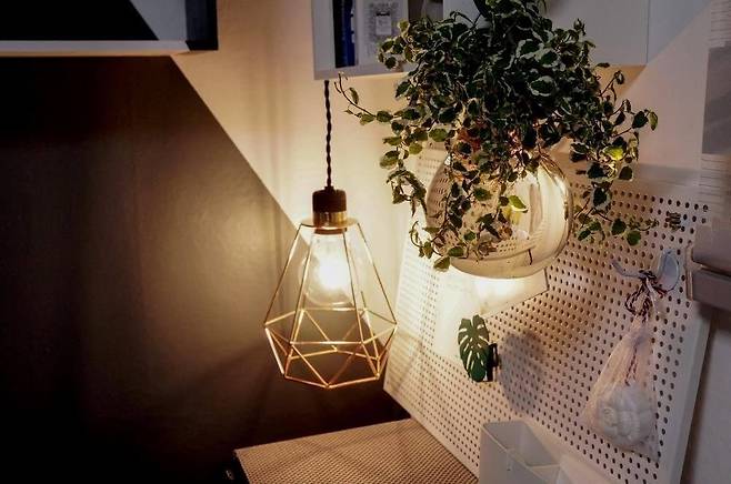 수납보드 : 문고리닷컴 타공판 인테리어 수납보드 Midi / 조명 : 라디룸 인테리어 스탠드 조명 : Mr.(The R.Wire Type) / 화병 : 모던하우스 메탈 핸들 전구 유리화병M / 식물 : 식물도감 푸미라