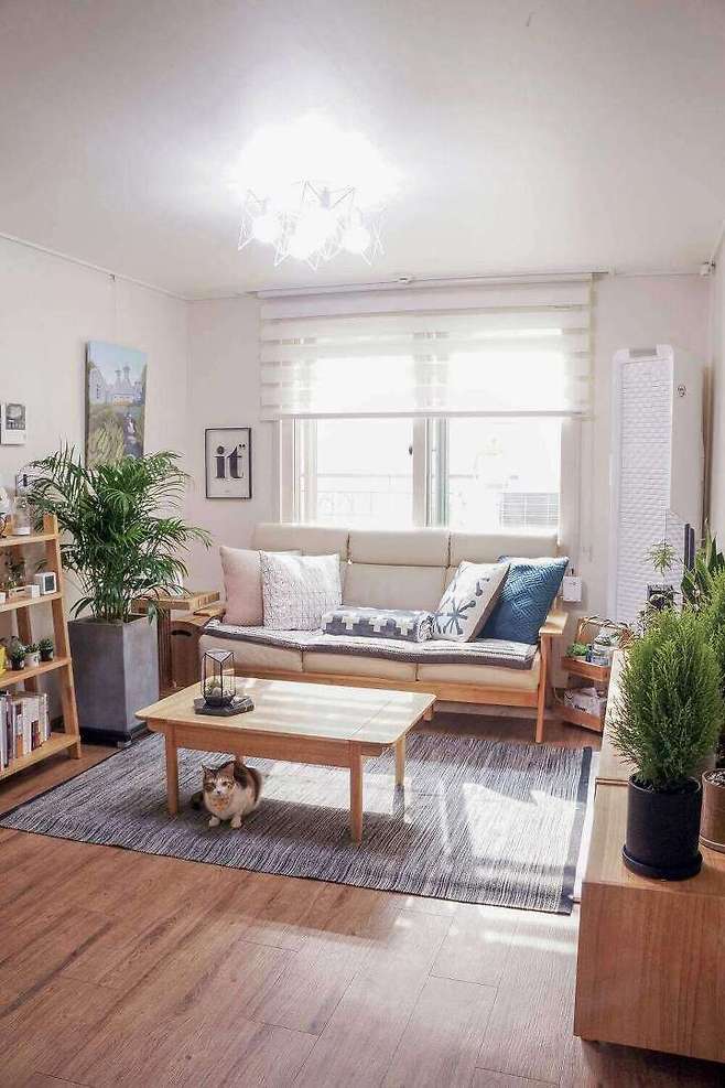 채광이 쨍하고 인사해주는 거실이라 늘 가장 많은 시간을 함께하는 공간인 거실이에요. 둘째 호두양이 인사하네요. “어서오라옹~^^”