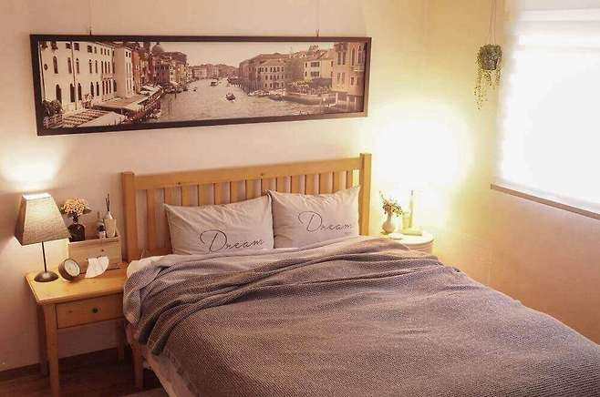 저녁에는 양쪽에 있는 테이블 조명으로 은은하게 분위기를 만들어 줄 수 있어요. 액자 속 사진은 저희 부부의 신혼여행지였던 베니스에요. 저희는 ‘베니스의 상인’을 재미있게 읽고 갔던 추억이 좋아 액자로 걸어놨어요. 결혼 20주년쯤에 다시 한 번 가보고 싶네요..