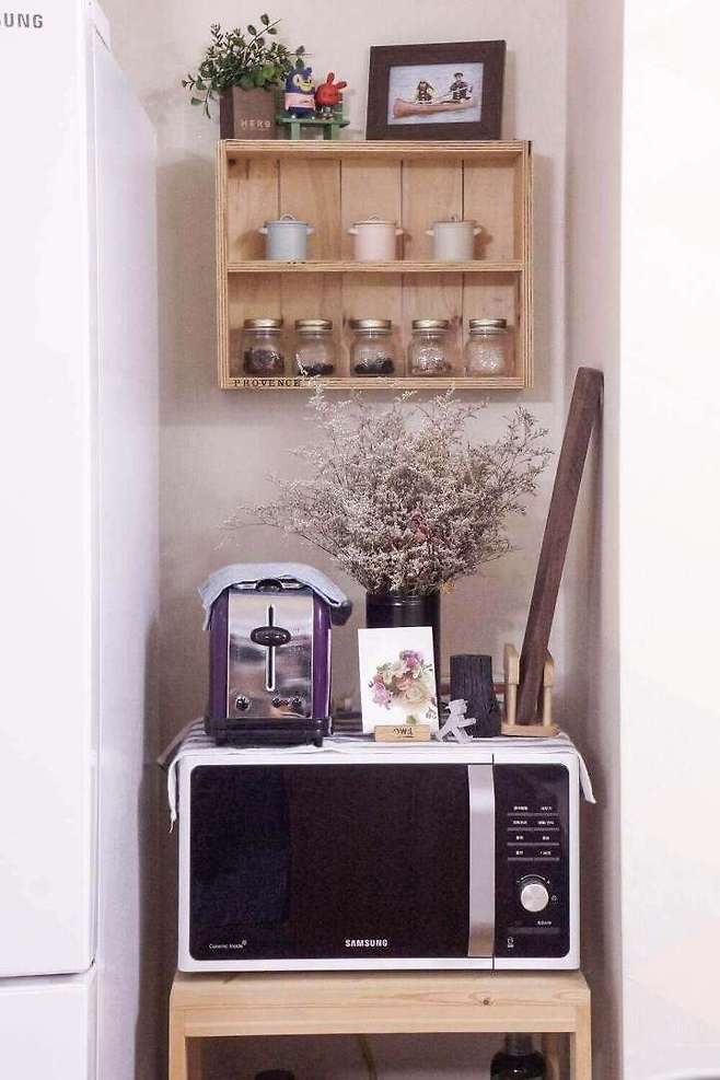 선반과 전자렌인지대 등 수납함 모두 사이즈에 맞춰 직접 만들었는데 자세히 보면 만든 티가 나지만 요긴하게 쓰고 있어요.