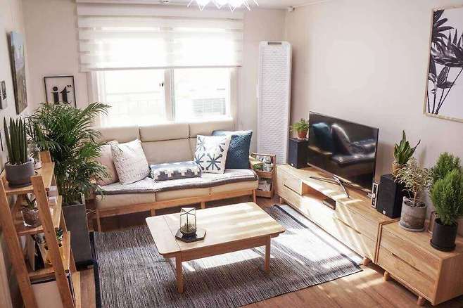 소파 : 장인가구 러버 소파 / 러그 : 데코뷰 인디아 면러그 / 천장조명 : 샛별하우스 체코 5등 직부 / 블라인드 : 코지샵 소프트 콤비 블라인드