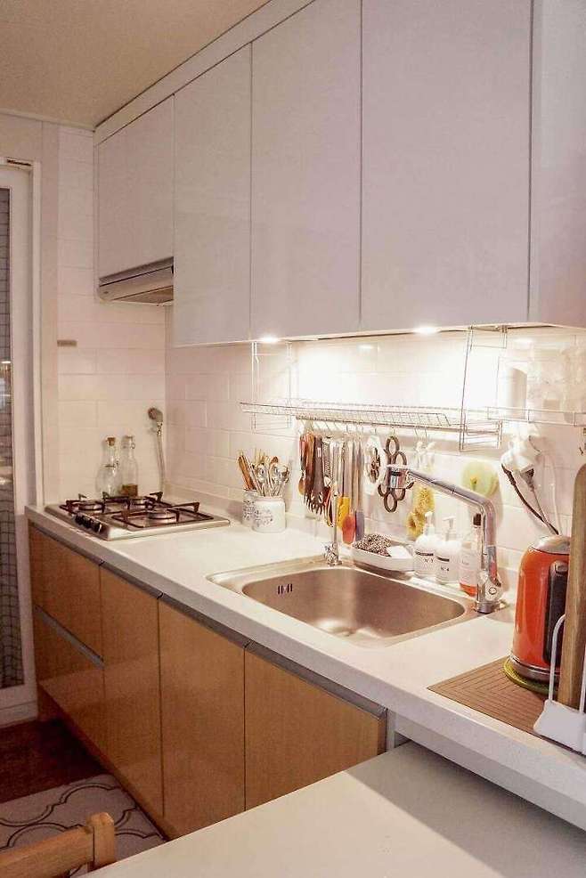 싱크대는 전세라서 시공되어 있는 그대로 사용하고 있어요. 다만 어두운 것 같아서 간접 조명만 달아주고 조리도구는 찾기 쉽도록 쭉- 걸어주었어요. 좀 지저분해 보이지만 이곳에서는 실용성이 우선이라 이렇게 사용해요.
