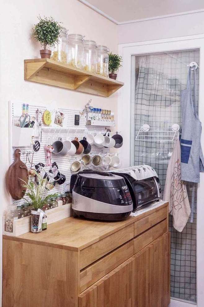 원목 장 위에 대형 타공판을 달아 자주 사용하는 컵, 허브 등을 수납해 사용하고 있어요. 찾기도 쉽고, 인테리어 효과도 좋아 만족해요. 나중에 면적이 큰 집에 가면 냄비까지 타공판에 달고 싶네요.