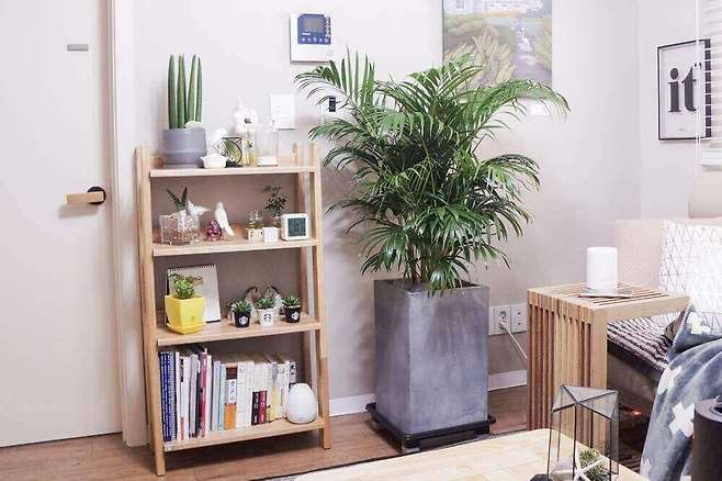 저희 집 초록이 대장인 아레카 야자가 조명과 함께 분위기 내는 역할을 해요. 조명에 비춘 잎의 색과 만들어지는 그림자가 그렇게 만들어 주는 것 같아요.