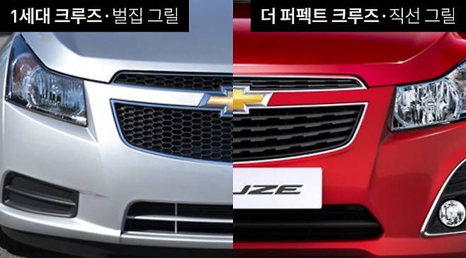 이후 크루즈 시대가 시작되며 라세티는 쉐보레 엠블럼이 자리 잡은 그릴로 전면 교체가 되는데요. 최초 벌집 모양이었던 크루즈의 그릴은, 역동성을 강조한 퍼펙트 크루즈로 넘어가며 직선 형태의 그릴로 변경이 됩니다. 확실히 직선 그릴이 강해 보이는 효과가 있는 것 같죠?