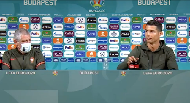 그의 심기를 거스른 게 있었다. 회견장에 놓인 콜라 두 병이었다. 호날두는 콜라병을 어리둥절한 표정으로 지켜보더니, 이윽고 두 병을 눈앞에서 치웠다. 물병을 들고 현장에 참석한 기자들에게 “물을 마셔라”라고 말했다.