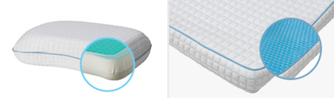 쿨링 젤을 넣은 베개와 매트리스가 있는 침대 위로