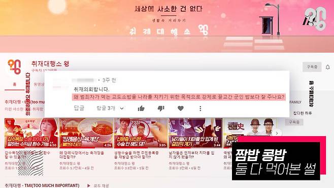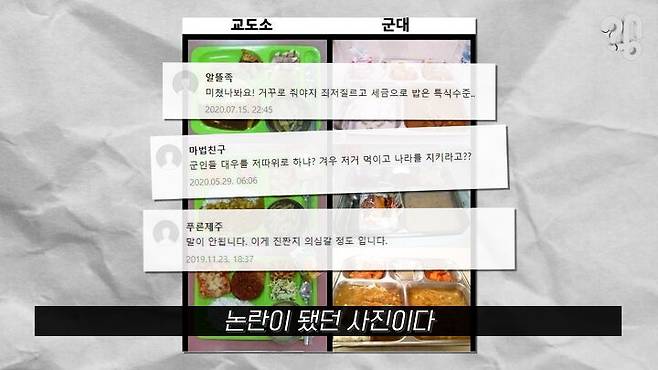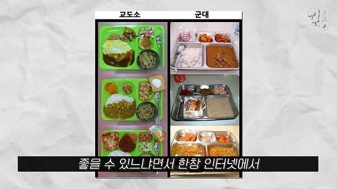 유튜브 댓글로 “죄 짓고 교도소 들어간 범죄자의 식단이 왜 나라 지키러간 군인보다 좋은지 취재해 달라”는 의뢰가 들어와 수소문 끝에 군대와 교도소 두 곳에서 모두 취사 업무를 했던 사람을 찾아 물어봤다.