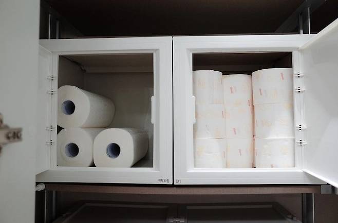 사실 이건 아이가 어렸을 때 기저귀 정리함으로 사용하던 트롤리인데요, 저희 집에서는 팬트리에서 물티슈와 휴지를 보관하는 용도로 사용하고 있어요.