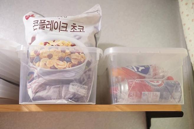 윗 칸에는 잡곡, 씨리얼, 과자 등을 눅눅하지 않게 보관할 수 있는 통을 진열해놓고,
