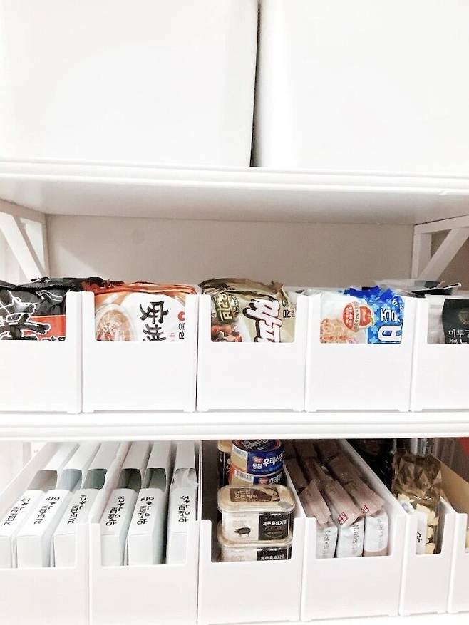 여기에 크게 도움이 된 게 바로 이 화이트 수납 정리함이에요. 특히 봉지 라면 사이즈에 딱 맞아서 라면을 종류별로 보관하기 아주 좋거든요.