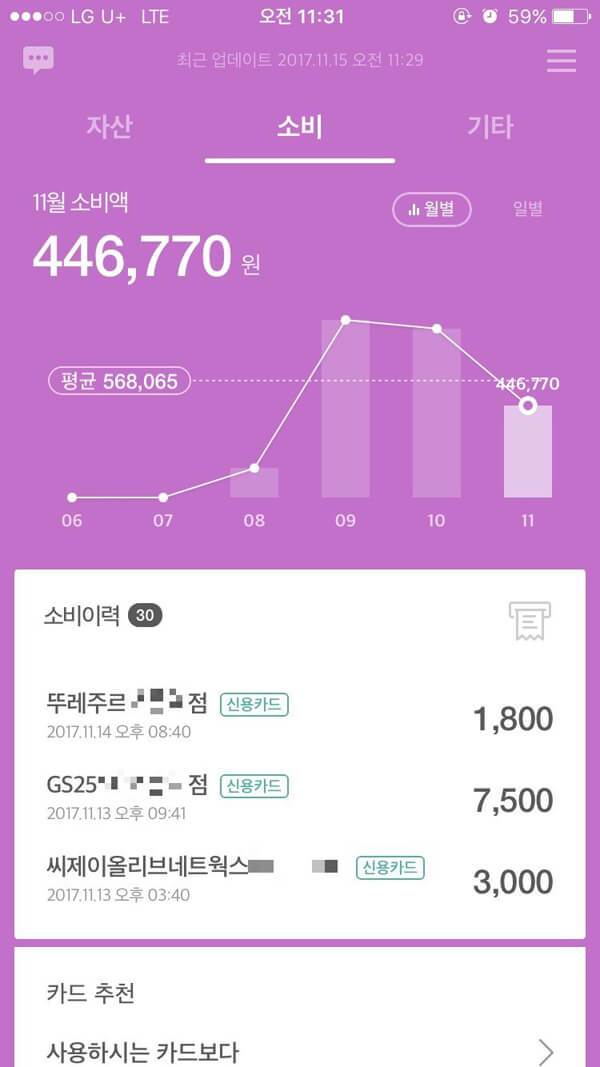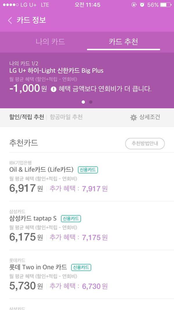 사용자의 소비패턴을 분석하고 그에 맞는 카드를 추천해주는 기능이다. 카드의 월 평균 혜택은 할인금액과 적립금액을 합산한 뒤 연회비를 제외한 금액으로, 혜택보다 연회비가 클 경우 사용자가 더 많은 혜택을 누릴 수 있는 카드를 추천해준다. 기본적으로 할인/적립에 따라 카드를 추천해주지만, 항공마일에 따라 카드를 추천받을 수도 있다.