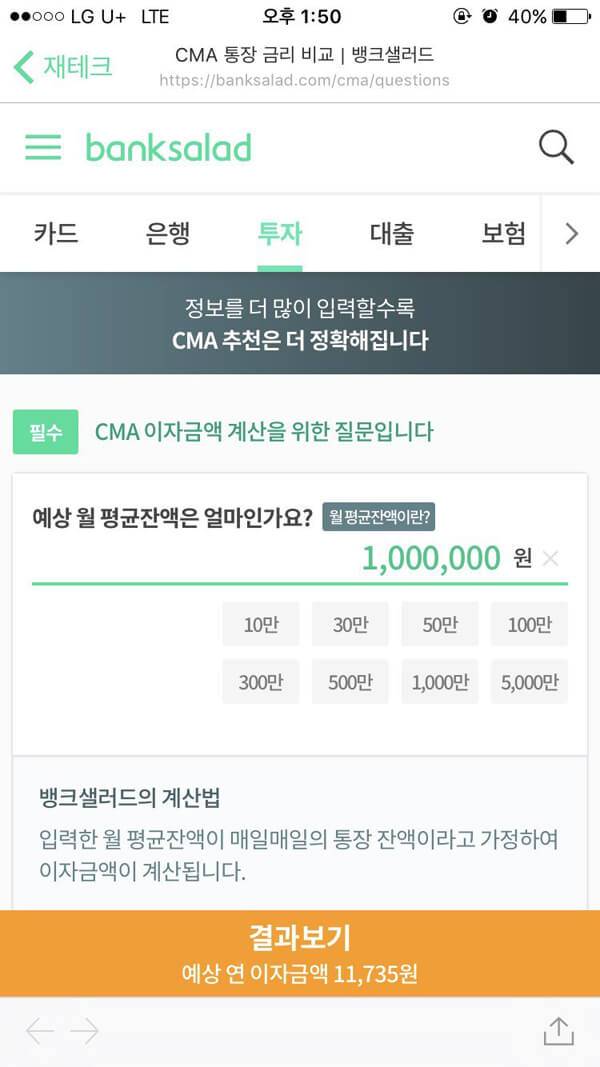 매달 정기적금을 하는 것도 좋은 방법이지만, 투자로 수익을 창출하는 것도 괜찮은 방법이다. 뱅크샐러드의 투자 메뉴에서 월 평균 잔액을 설정하면, 21개 증권사 중 금리가 가장 높은 CMA를 추천받을 수 있다. 투자를 해보고 싶지만 투자에 대한 정보가 없어 망설이고 있었다면 뱅크샐러드의 투자 기능을 이용해보는 것도 좋겠다.