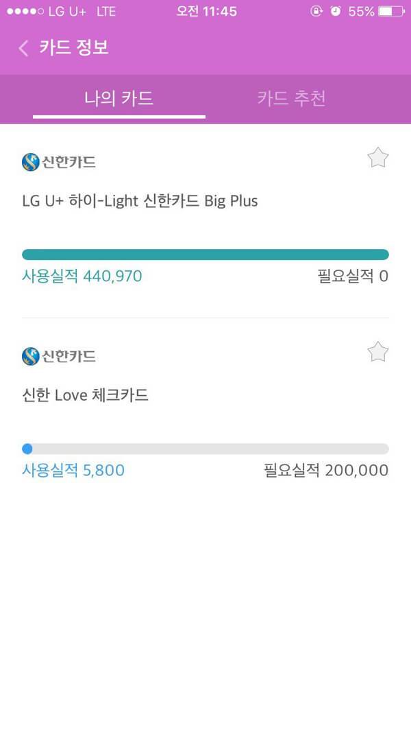 현재 사용하고 있는 카드의 필요 실적과 사용 실적을 알려주는 기능이다. 카드마다 필요 실적이 달라 여러 개의 카드를 사용할 경우 실적을 채우지 못해 혜택을 받지 못하는 경우가 많은데, 카드 정보를 한눈에 확인할 수 있어 사용자가 다양한 카드 혜택을 누릴 수 있게 도와준다. 여러 개의 카드를 사용하고 있는 사용자들에게 꽤나 만족감을 줄 수 있는 기능으로 보인다.
