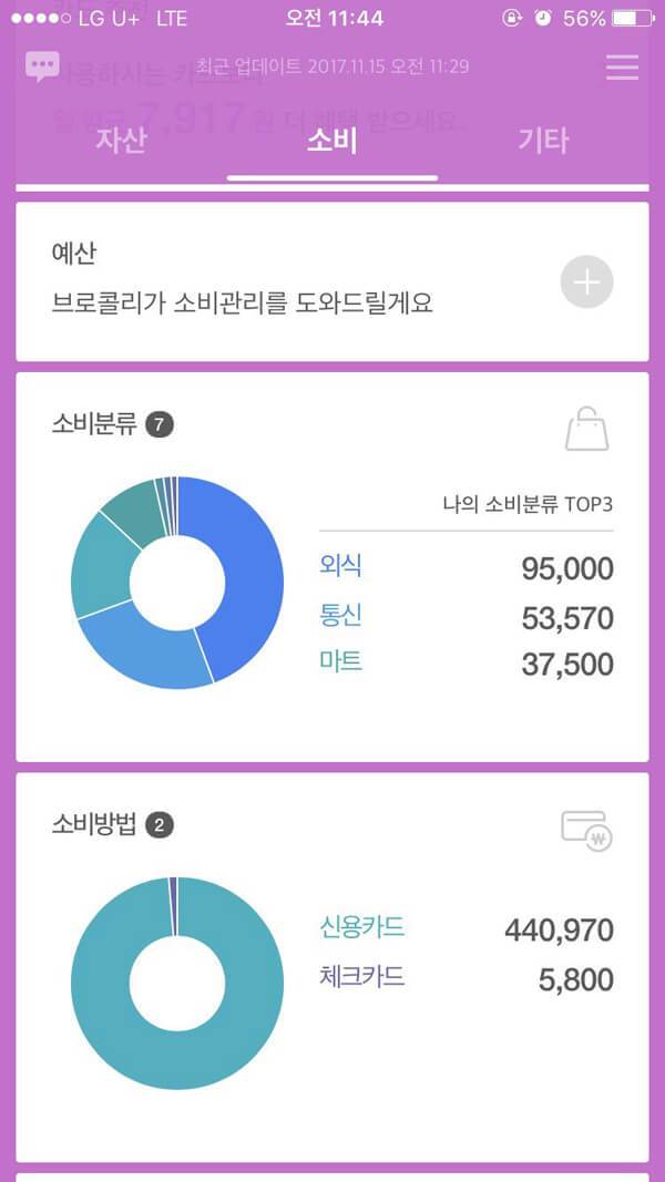 자산내역 및 소비내역을 막대그래프와 꺾은선그래프로 보여주기 때문에 이번 달 자산내역과 소비내역을 한눈에 확인할 수 있고, 지난달 내역과 쉽게 비교할 수 있다. 또한 예산을 설정하면 소비내역은 검정색으로, 예산내역은 흰색으로 표시해주기 때문에 이번 달 예산 중에서 몇 퍼센트 가량을 사용했는지 쉽게 파악할 수 있다. 아울러 자산, 소비, 기타 메뉴가 각각 다른 색상으로 이루어져 있어서 화면에 나타나는 색상만으로도 어떤 내역을 열람하고 있는지 알 수 있다.