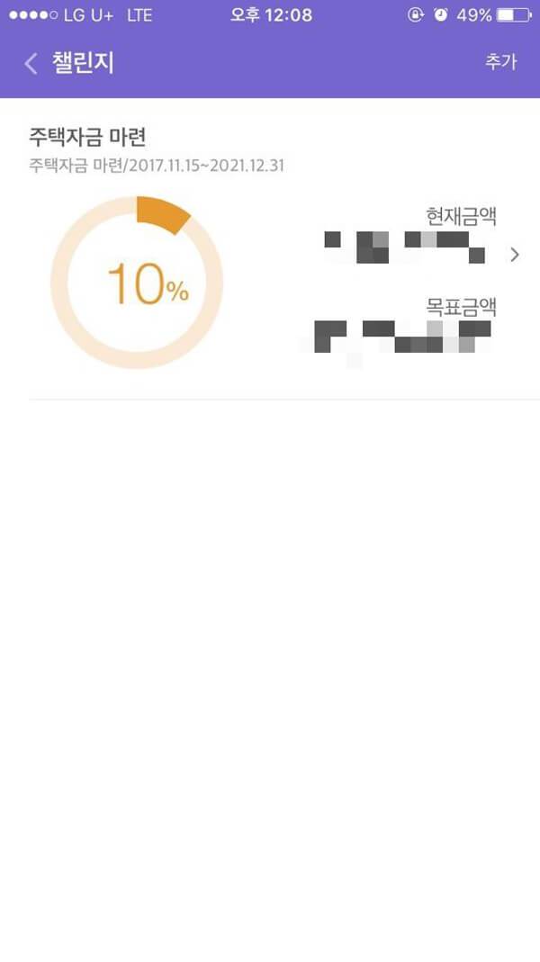 사용자 스스로 목표를 세우고 목표에 도달할 수 있도록 동기를 부여하는 기능이다. 카테고리와 목표이름, 목표일, 목표금액, 연동계좌, 월납입금액을 설정하면 챌린지가 추가되며 해당 챌린지의 달성률을 원형 그래프로 보여준다. 숫자와 그래프를 통해 목표 달성률을 직관적으로 확인할 수 있어 사용자 스스로 목표 달성에 대한 의지가 불타오르게 만든다.