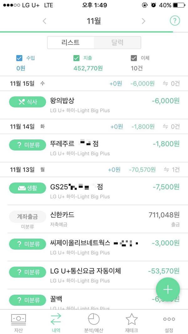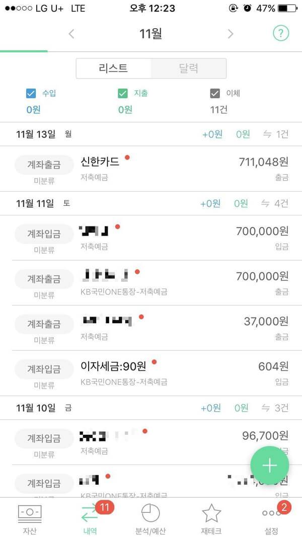 화면 상단의 ‘리스트’ 버튼을 클릭하면 이번 달의 수입, 지출, 이체 내역을 확인할 수 있으며 ‘달력’ 버튼을 클릭하면 매일 수입, 지출, 이체 상황을 체크할 수 있다. 또한 수입, 지출, 이체 왼편에 위치한 체크박스를 해제하면 해당 항목을 제외한 나머지 내역을 확인할 수 있다. 사용자가 원하는 대로 이번 달의 수입 및 지출 현황을 파악할 수 있어 편리하다.