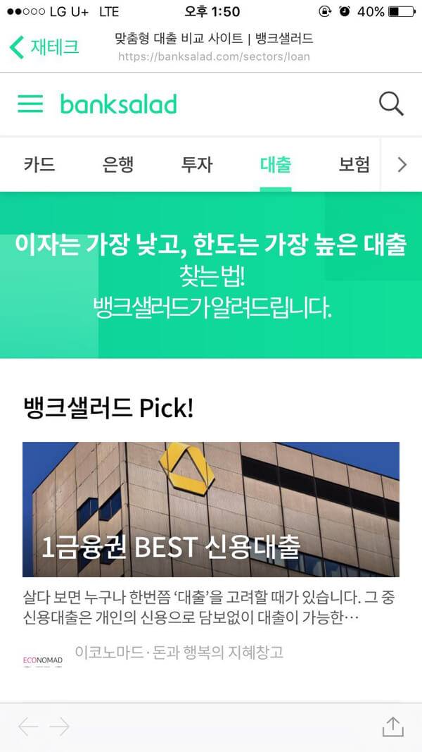 웬만하면 대출을 받지 않는 것이 가장 좋지만, 어쩔 수 없이 대출을 받아야 하는 경우가 있다. 이럴 때 뱅크샐러드의 대출 메뉴에서 금리가 가장 낮은 대출을 추천받을 수 있다. 뱅크샐러드가 추천하는 제1금융권 및 제2금융권의 대출상품을 한눈에 볼 수 있으며, 경제전문가의 금융리뷰를 통해 대출에 대한 정보를 쉽게 파악할 수 있다.