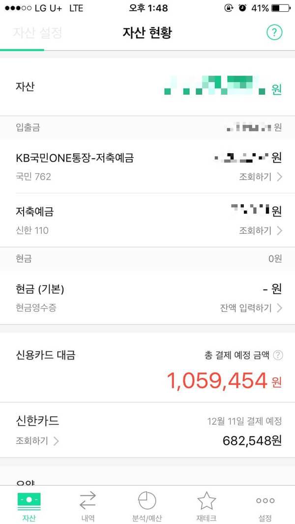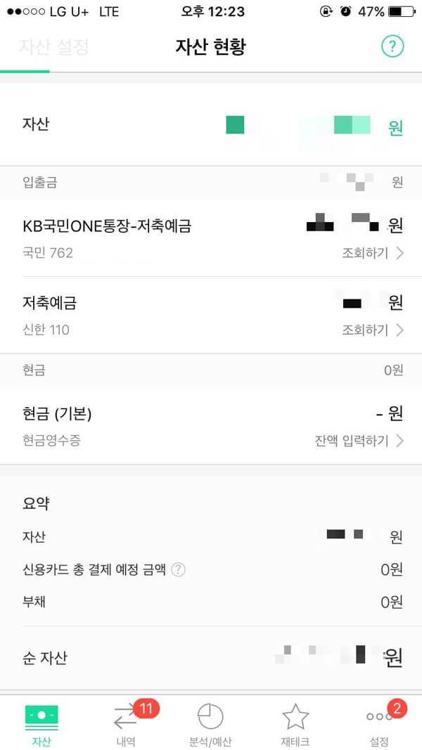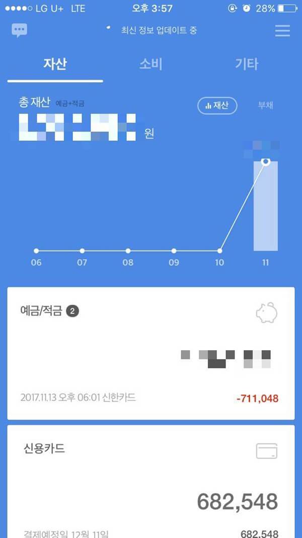 입출금 통장 잔액과 현금, 실물 자산, 주식, 펀드 등을 합산한 총 자산에서 신용카드 대금 내역, 대출을 제외한 순 자산을 한 번에 체크할 수 있다. 별도의 은행 앱 또는 카드 앱을 실행하지 않고 통장의 이름을 클릭해 계좌를 조회할 수 있으며, 신용카드 결제 예정 내역을 클릭해 사용 내역을 확인할 수 있다.