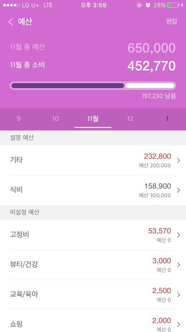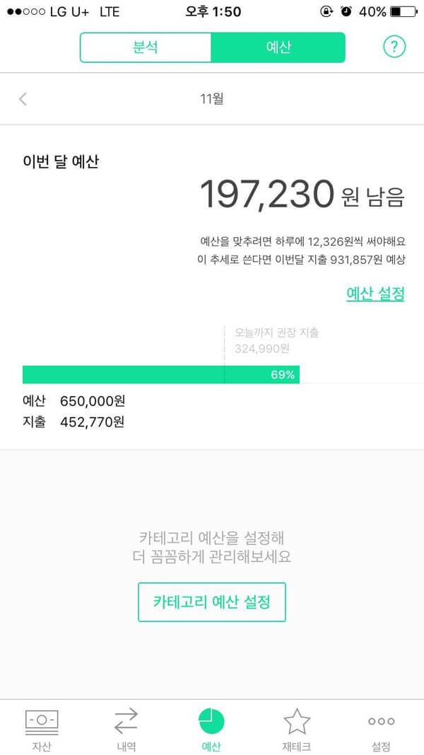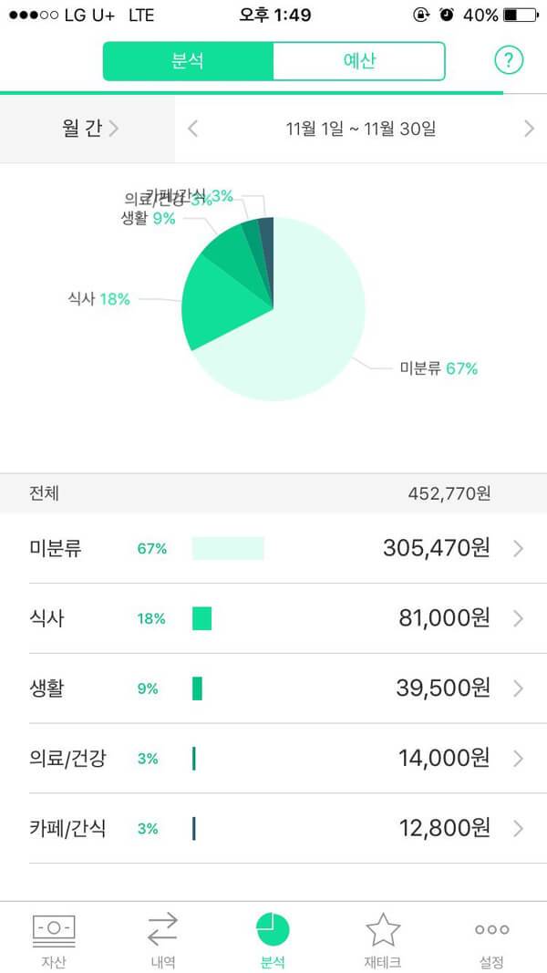 화면 상단의 ‘분석’ 버튼을 클릭하면 어느 부분에 얼마만큼 지출을 했는지 원형 그래프와 리스트로 보여준다. 기본 설정은 월간으로 되어있지만 주간, 연간, 최근 3개월, 최근 6개월로 변경할 수 있으며 사용자가 원하는 특정 기간을 설정할 수도 있다. 또한 ‘예산’ 버튼을 클릭해 이번 달 예산을 설정하면, 현재까지 얼마만큼 지출을 했고 현재 남은 예산이 얼마인지 쉽게 확인할 수 있다.