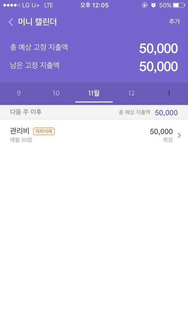 매달 반복되는 고정지출을 관리할 수 있는 기능이다. 고정지출의 이름, 청구 기관, 납부 유형, 금액, 청구 일자, 반복유무를 설정해 머니 캘린더에 등록할 수 있으며 총 예상 고정 지출액과 남은 고정 지출액을 알려준다. 매달 정기적금을 하고 있거나 공과금을 납부하고 있다면 머니 캘린더를 활용해 고정지출을 관리하는 것도 좋은 방법이다.