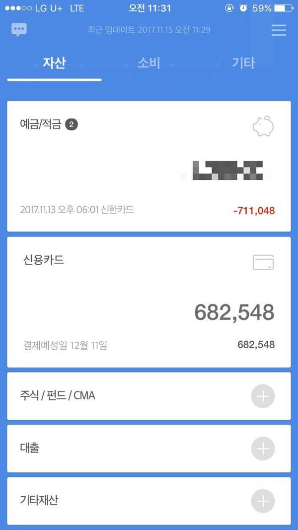 하단 : 예금/적금, 신용카드, 주식/펀드/CMA, 대출, 기타재산 내역