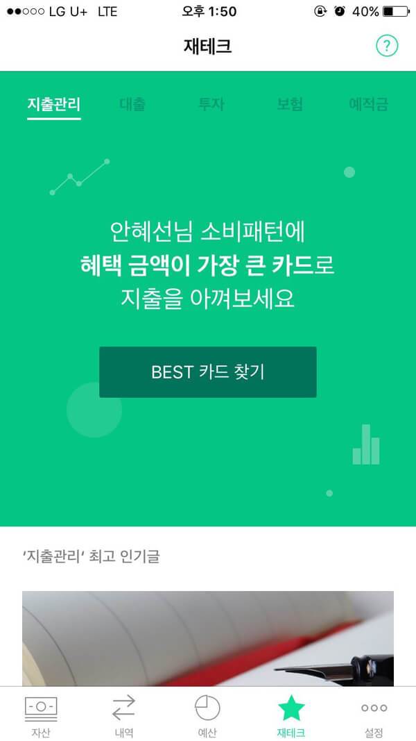 사용자의 소비패턴을 분석해 혜택이 가장 큰 카드를 추천해주고, 지출에 대한 조언을 해주는 기능이다. 우선 화면 중단에 위치한 ‘베스트 카드 찾기’ 버튼을 클릭해 카드 유형, 선호하는 혜택, 월 평균 사용 금액, 소비패턴 항목을 선택하면 사용자가 가장 많은 혜택을 누릴 수 있는 카드를 추천해준다. 또한 지출관리에 대한 조언과 재테크 팁을 공유해 자신도 모르게 새어나가는 돈을 막아준다.
