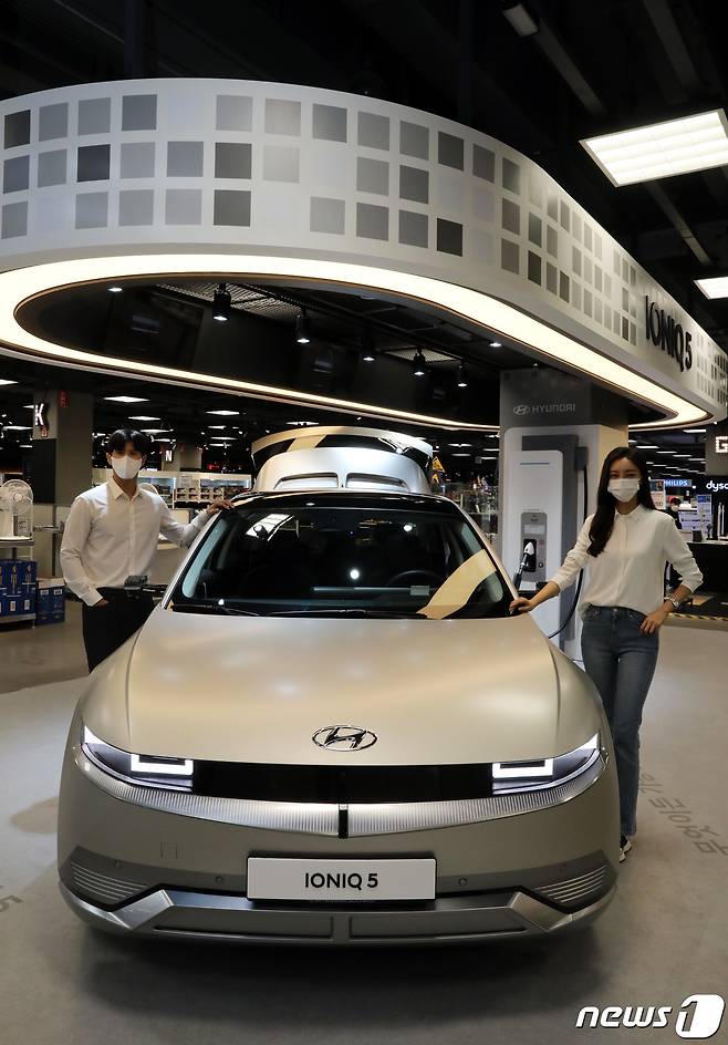 (서울=뉴스1) = 27일 오전 이마트 죽전점 일렉트로마트에서 모델들이 현대자동차의 전기차 '아이오닉5' 팝업 전시장을 소개하고 있다.