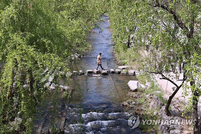 (서울=연합뉴스) 홍해인 기자 = 주말을 앞두고 서울 낮 기온이 17도를 넘어서며 포근한 날씨를 보인 9일 서울 중구 청계천 장통교 부근에서 점심 시간 직장인들이 산책을 하며 징검다리를 건너고 있다. 2021.4.9