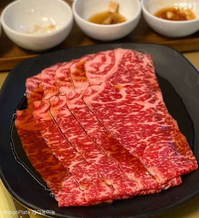 육회를 애피타이저로 시작하여, 늑간살, 꽃살, 추리 등 다양한 부위를 알맞게 제대로 구워 맛볼 수 있어요. 고기와 곁들이기 좋은 다양한 와인 리스트도 준비되어 있으니 참고!