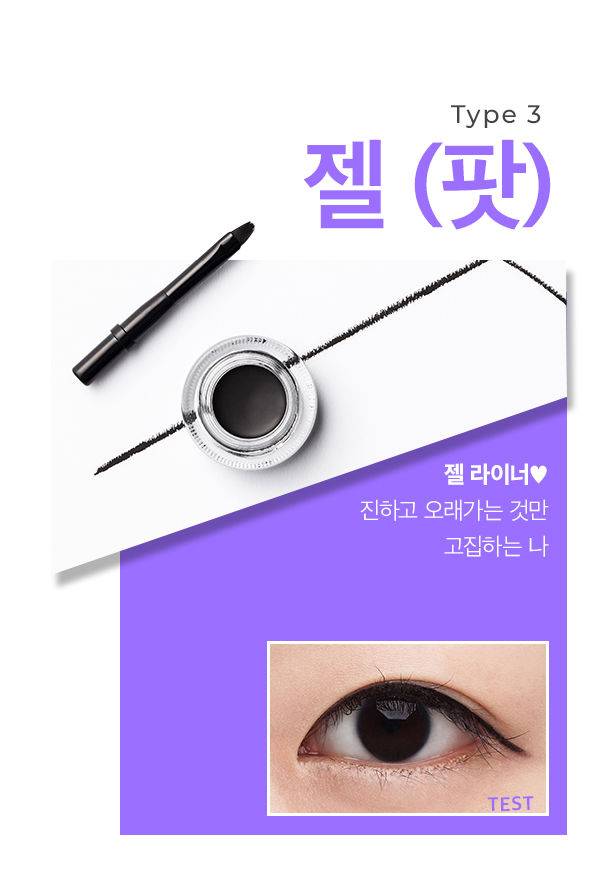 양 조절이 쉽지 않아 라인을 그리기 어렵다는 단점이 있지만, 진하고 깊은 눈매를 만들기에는 젤 타입만 한 것이 없다. 무게감 있는 제형이라 지속력과 발색이 좋아 선명하게 그릴 수 있기 때문. 다른 타입에 비해 수정이 어려워 신중을 기할 필요가 있다.