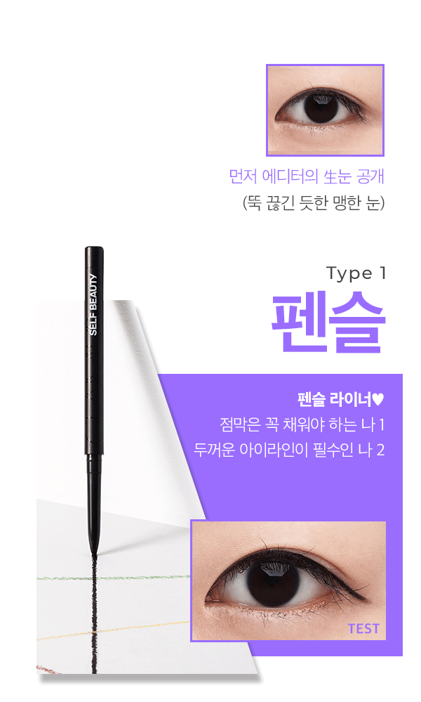 얇고 날렵한 느낌은 덜하지만 자연스럽게 그리기 가장 좋다. 유분기만 잘 제거하면 하루 종일 번지지 않고, 부드럽게 잘 그릴 수 있어, 쌍꺼풀이 없는 무쌍들도 두꺼운 라인을 그리기 가장 적합한 타입. 라인을 그린 후 손이나 브러시로 넓게 스머지 하기에도 좋다. 특히 라인을 길게 빼지 않고 점막을 채우는 데 시간 할애를 많이 한다면 꼭 필요하다.