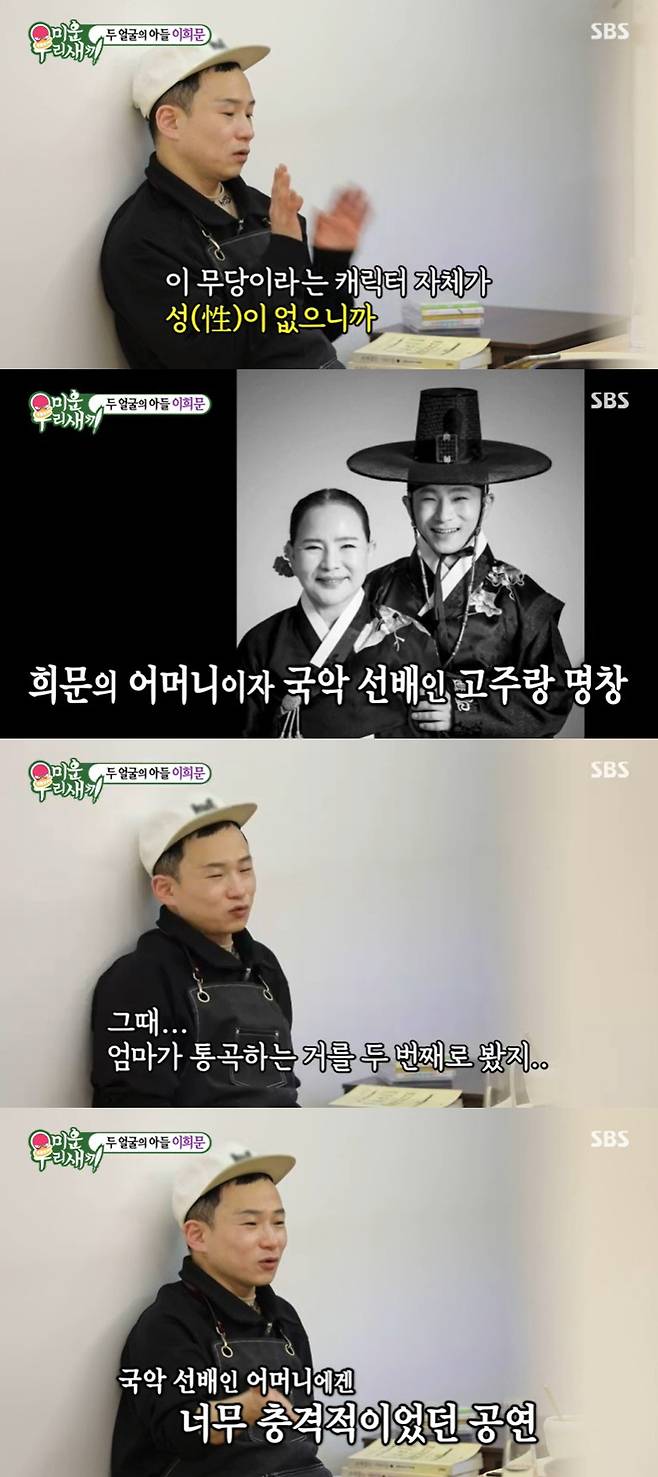 하지만 고주랑 명창이 공연을 보고 눈물까지 흘렸다고. 이희문은 "그때 엄마가 통곡하는 걸 두 번째로 봤다. 아버지 돌아가시고 한 번, 내 공연이 두 번째였다"며 "엄마는 자존심이 상했던 거다. (본인 입장에서) 창피해 죽겠는 공연을 하니까 속상하신 거다. 공연 내내 관객들만 쳐다보셨다. 반응만 보신 것"이라고 밝혔다.