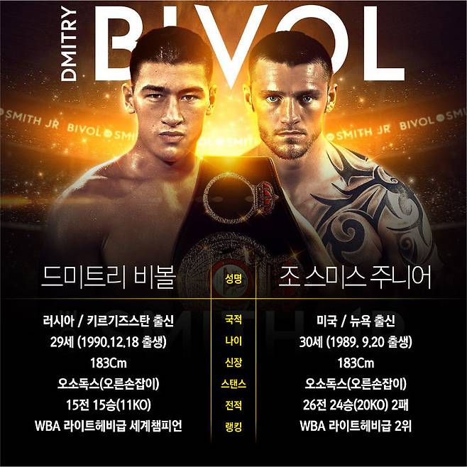 러시아 선수로 미국에 진출, WBA 타이틀과 15전 전승에 11KO라는 기록을 쓴 선수이자 두 아이의 아빠. 이번 상대는 미국 뉴욕 출신의 조 스미스 주니어. 상대의 텃밭인 뉴욕에서 맞대결을 펼치게 됩니다.