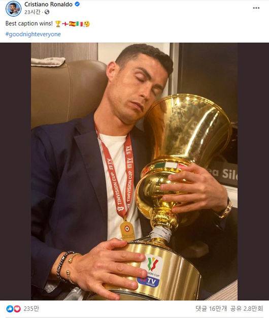 호날두는 20일 자신의 SNS에 사진 한 장을 올렸다. 이탈리아 컵대회 우승트로피를 끌어안고 잠든척 하는 자신의 사진을 올린 호날두는 “여기에 맞는 댓글을 달아보세요”라고 적었다.