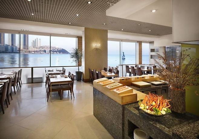 해운대를 바라보며 즐실 수 있는 ‘까밀리아’ 레스토랑! 올스테이 패키지에는 20만 원 상당의 ‘까밀리아 뷔페 이용권’이 포함되어 있어요. 투숙하는 당일 저녁 또는 체크 아웃 후 런치 타임 중 선택하여 이용할 수 있답니다.
