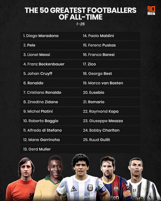 '90MIN'의 선택은 마라도나, 펠레, 메시 순이었다. 클럽에서의 활약상보다는 전 세계 최고의 축구 축제인 월드컵에서의 모습에 더 중점을 두고 평가한 것으로 보인다. 메시와 함께 경쟁구도를 이어오고 있는 크리스티아노 호날두는 5위에 올랐다. 현역 선수 중 50위 안에 든 선수는 안드레스 이니에스타, 지안루이지 부폰, 로베르토 레반도프스키, 루카 모드리치가 전부였다.
