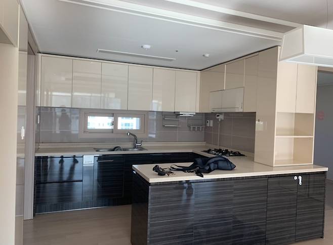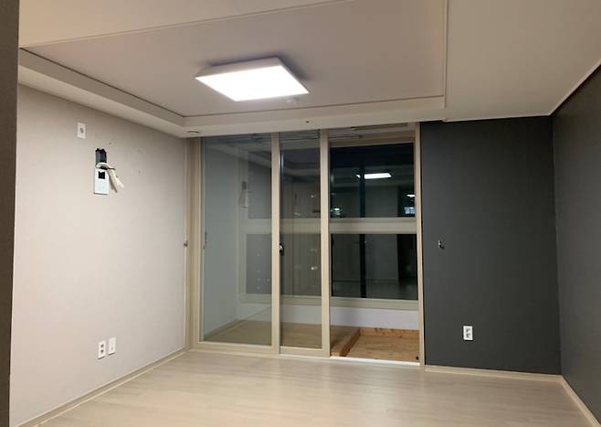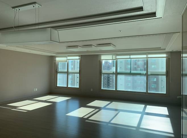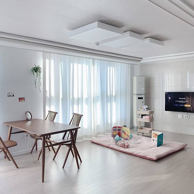 이 집을 선택한 가장 큰 이유는 평수 대비 넓은 거실 때문이었어요. 사진에 보이는 좌측의 작은 창은 원래 방으로 분리되는 공간인데, 대부분의 세대가 입주 시 방 대신 거실로 확장하는 걸 택했더라고요. 아무래도 온 가족이 거실에서 보내는 시간이 많으니 방의 개수보다 넓은 거실이 있는 게 효율적이라 생각한 것 같아요.