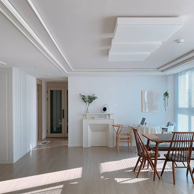 거실은 벽지와 걸레받이, 몰딩 외엔 아무것도 고치지 않았어요. 남향의 고층 집이라 온종일 집안 깊숙이 들어오는 햇살만으로도 충분히 마음 꽉 차는 공간이에요.