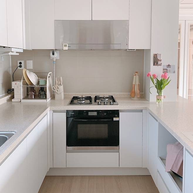 만약 이곳이 저의 신혼집이었다면, 유행 따라 상부장을 없애고 선반을 달았을지도 몰라요. 하지만 주부 생활을 오래 해보니 주방 기름때와 먼지를 매번 부지런히 닦으며 깔끔히 유지할 자신이 없더라고요.