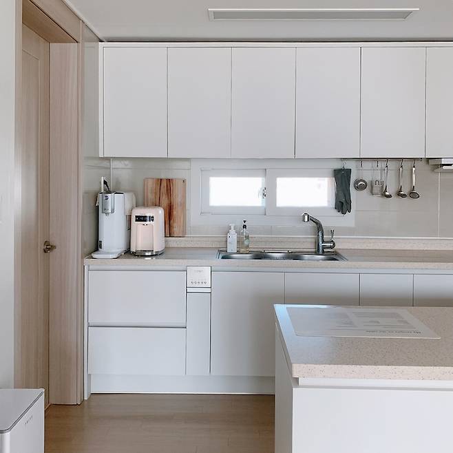 신혼 땐 예쁜 양념 병과 조리도구를 전부 꺼내 두고 열심히 쓸고 닦으며 관리했어요. 그런데 살림에 육아까지 해야 할 일이 늘어나니 상,하부장의 수납공간을 최대한 확보하고 싱크대 위를 깔끔하게 유지해야 살림의 피로도를 줄일 수 있겠단 생각이 든 거예요. 자주 손이 가는 조리도구만 꺼내두고 대부분의 주방용품은 숨겨두었습니다. 일주일에 한 번 싱크대 상판과 벽면을 수세미로 박박 문질러 닦아 뽀득뽀득한 주방을 유지하는 게 저의 즐거움이에요.