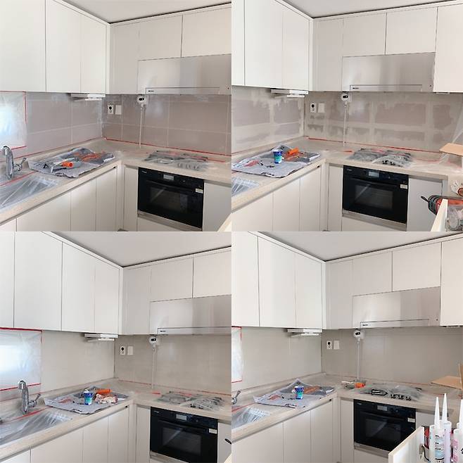 필름 시공 전의 주방이에요. 하이글로시 상부장 그리고 난해한 색감과 패턴의 하부장이 너무 싫었어요. 몇 년 전 해외 자료에서 본 주방에 반해 스크랩해둔 게 있었어요. 상,하부장과 상판, 타일까지 모두 무광 아이보리 컬러인 주방이었죠. 비슷한 느낌을 내고자 대리석 업체에 견적을 의뢰했는데, 상판과 벽면 타일 시공 가격만 200만 원 정도였어요. 그런데 막상 실측해보니 우측 상부장 붙박이와 싱크볼 아래 보일러 분배기로 인해 제 상상과는 다른 결과물이 나올 거 같아 결국 포기했어요.