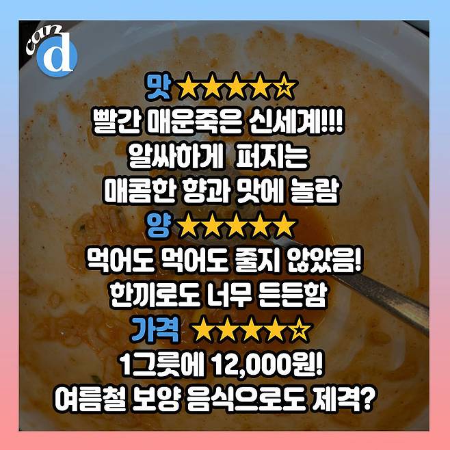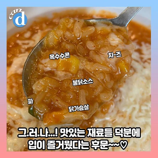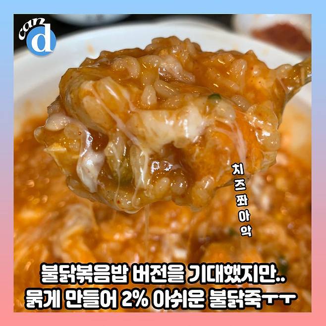 덜컥 겁이 난 canⓓ는 치즈 토핑 올라간 '치즈 불닭죽'을 맛보았습니다.