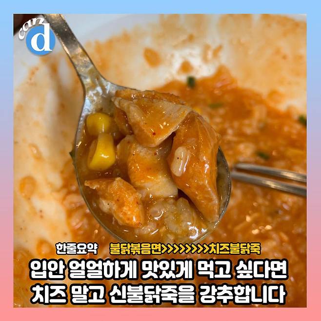 오늘의 canⓓ픽이 바로 '치즈불닭죽'입니다.