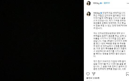 그러면서도 "제가 친구 아버지의 직업에 대해 좋지 않은 이야기를 하고 다녔다는 글을 봤다. 그 글을 처음 접하고 글에서 언급된 친구에게 연락을 했다. 서로의 기억이 조금 다르긴 했으나, 결과적으로 저 때문에 상처를 받았던 친구의 마음을 알게 됐고 진심으로 사과를 전했다"라고 알렸다.