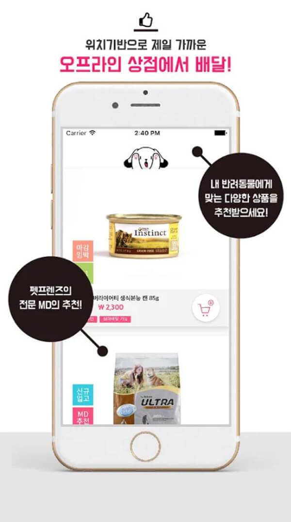 국내 최초 위치 기반 반려동물 모바일 앱 '펫프'는 반려동물의 사료와 간식, 용품을 간편하게 주문할 수 있는 앱이다. 사용자가 상품을 주문하면 사용자의 가장 가까운 곳에 위치한 오프라인 상점에서 1시간 이내에 배달을 해주기 때문에 수제간식이나 생식 등 유통기한이 짧은 간식도 마음 편히 구매할 수 있다. 현재는 서울 강남구, 서초구, 용산구, 송파구, 성동구, 광진구만 이용 가능하며 빠른 시일 내에 서비스를 확대할 계획이다.
