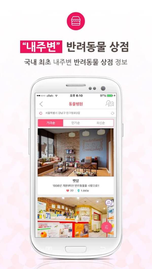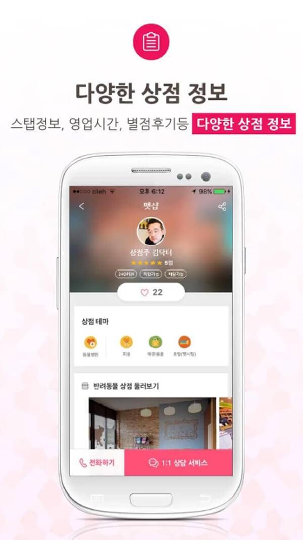 또한 사용자의 주변에 있는 동물병원, 호텔, 미용, 반려동물 동반 펜션, 분양, 훈련소, 장례식장, 카페, 놀이터 등 다양한 반려동물 상점 정보를 제공한다. 상점의 내부 사진은 물론 주인과 스탭 사진, 별점, 후기, 영업시간, 서비스 정보 등 다양한 정보를 한눈에 파악할 수 있어 반려인들에게 많은 사랑을 받고 있다.