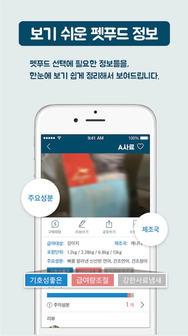뿐만 아니라 사료의 성분을 이해하기 쉽게 설명해 반려인들이 적절한 사료를 선택할 수 있도록 도와준다. 반려동물의 기호성과 냄새, 주의 성분 등이 직관적으로 표시되어 있어 새로운 사료를 구입할 때 참고하기에 좋다.